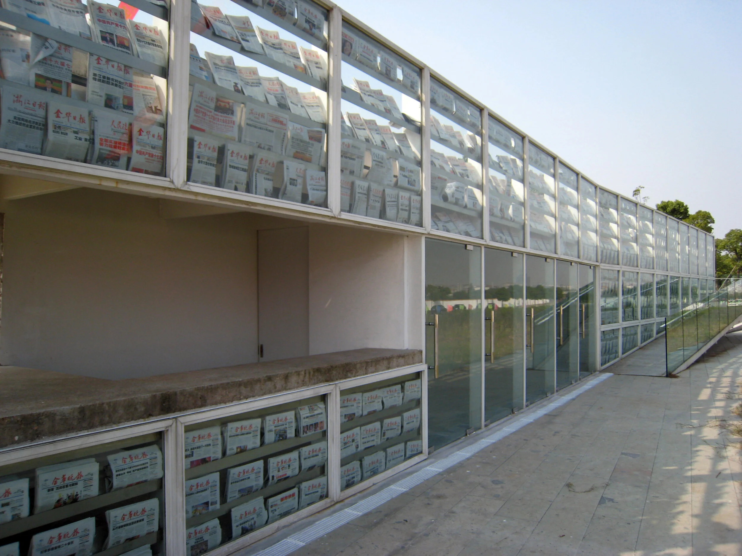 The building is a narrow folded plane with two façades. News media is displayed on the north wall facing the old city in a transparent glass and steel façade designed to display more than one thousand standard size Chinese newspapers. Viewed at different distances, the north façade either hides or reveals its content. At a further distance, the newspapers are no longer individually discernible, and compose an abstract texture. The wall facing the Architecture Park and museum is white plaster left intentionally blank to invite display, inscriptions and projections of art. The structure sits on a plaza made of local limestone aggregate and concrete.